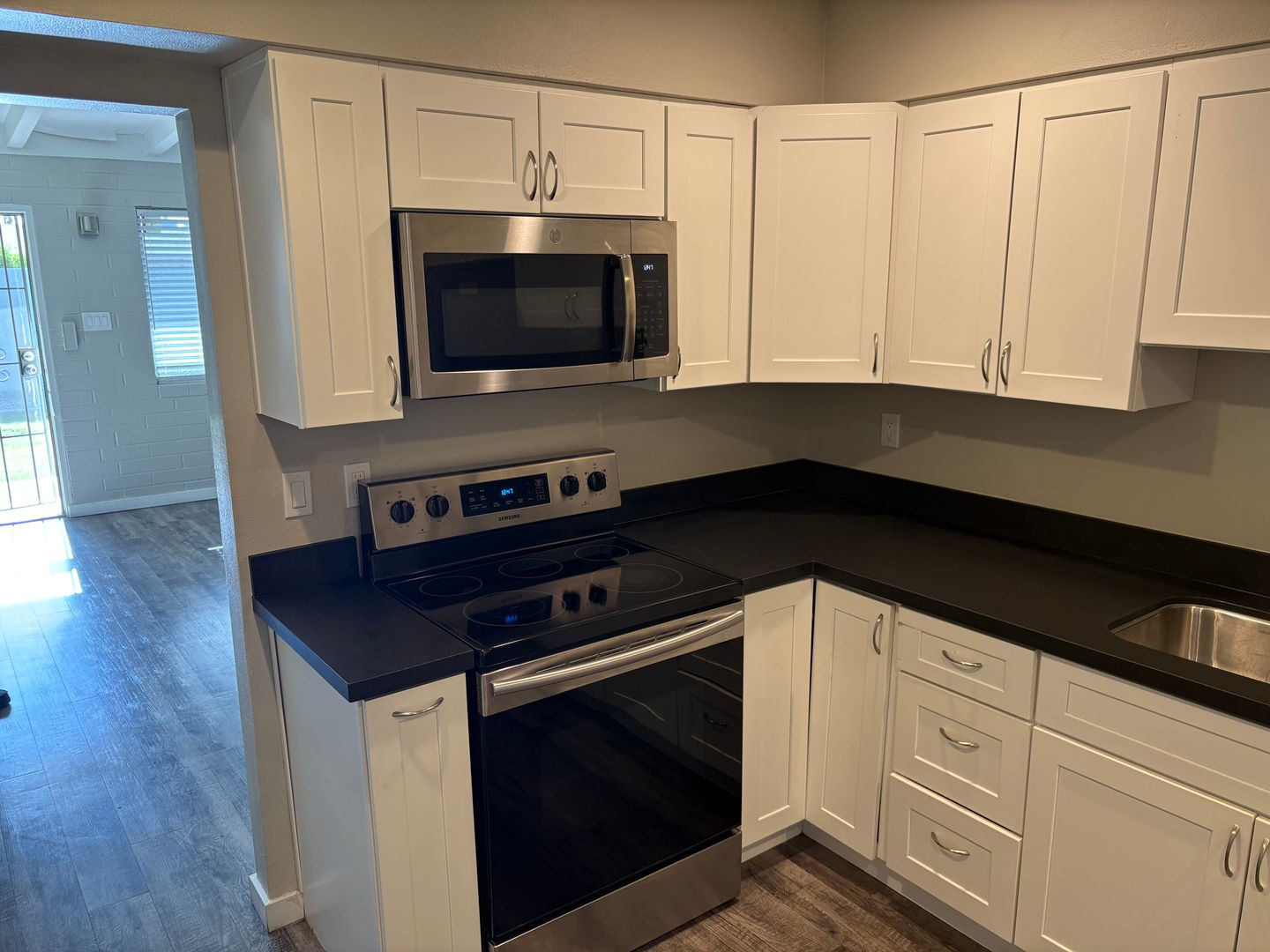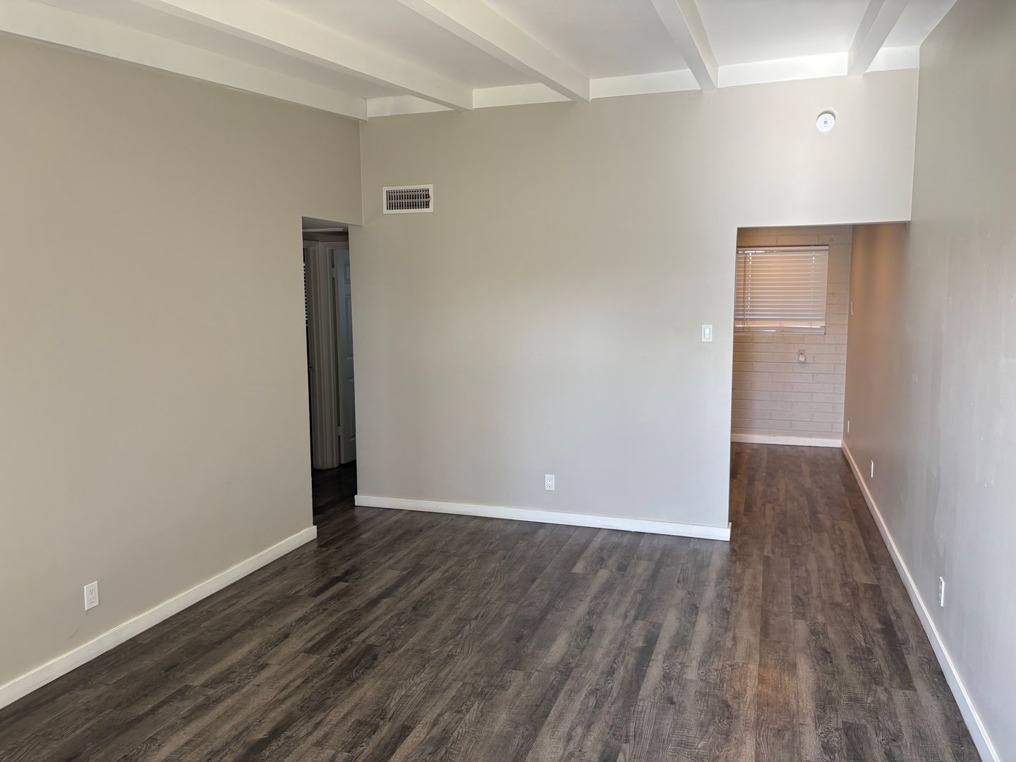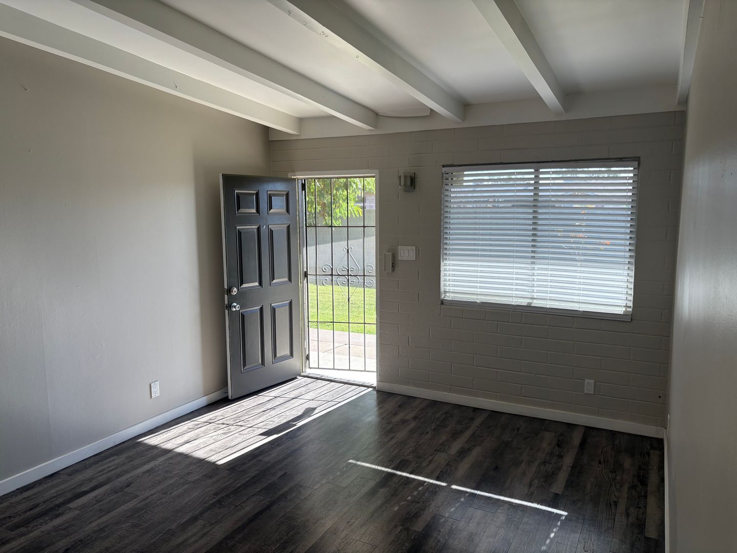 2 bedroom, 1 bathroom remodeled central Phoenix apartment. This unit has a number of upgrades including two tone paint, wood laminate flooring throughout with no carpeting, wood beam ceilings in the living room and bedrooms. Kitchen features upgraded cabinets and stainless steel appliances to include: refrigerator, stove top microwave, and electric range. Landscaped courtyard with grass area. Central location with easy access to the I-10, I-17 and 51 freeways.