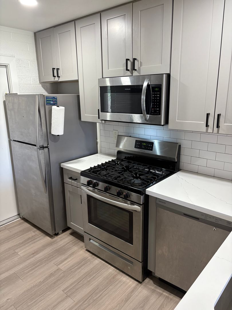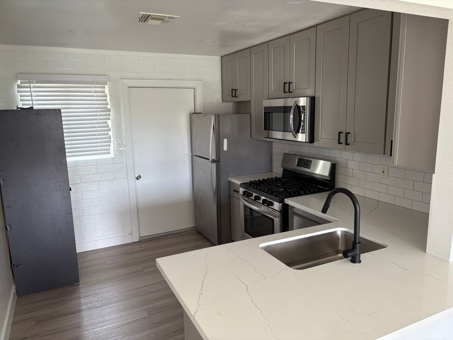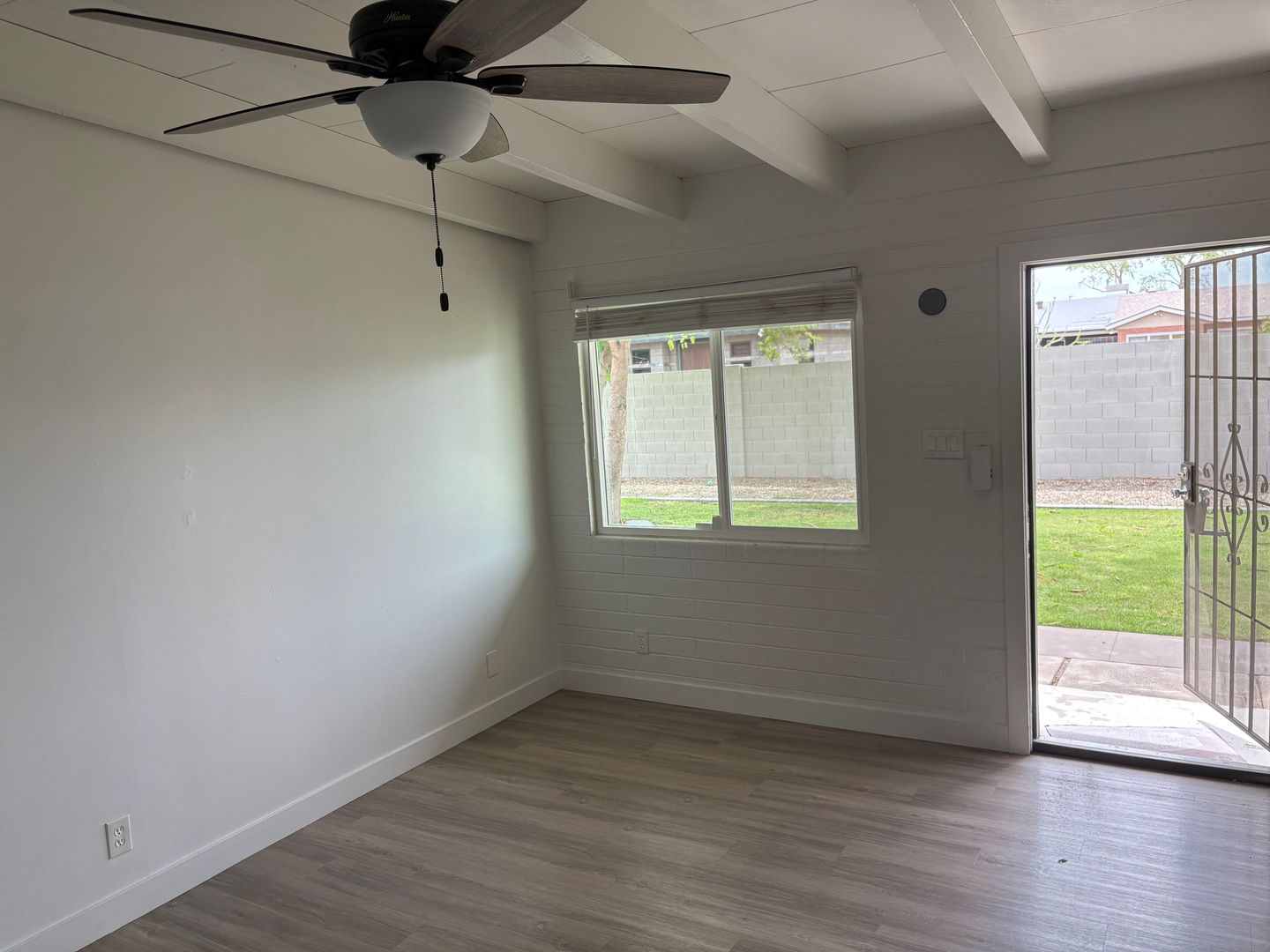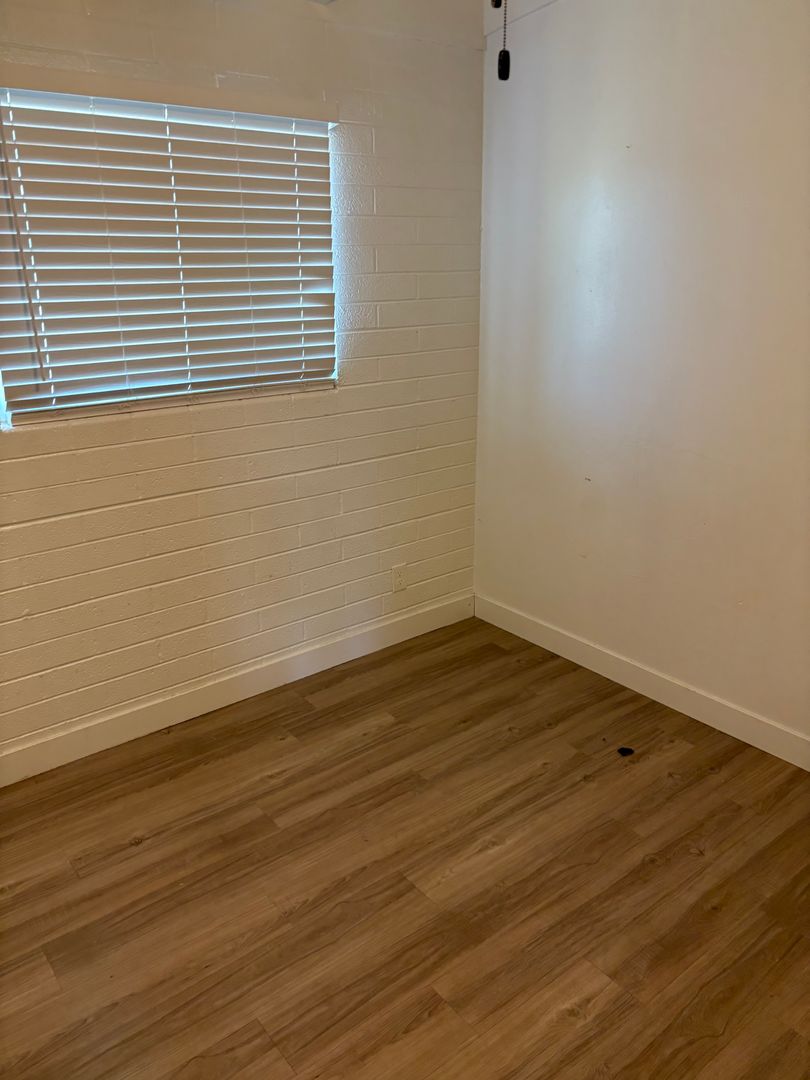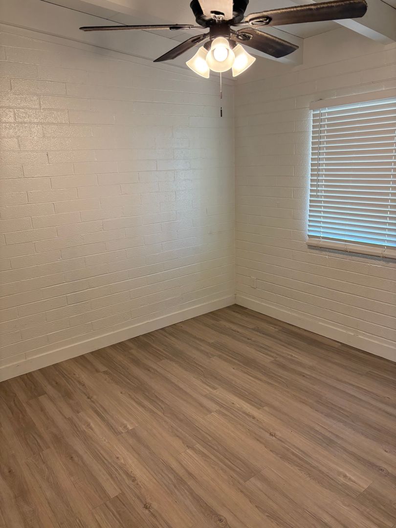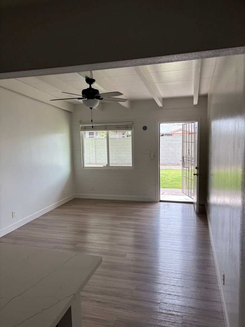 2 bedroom, 1 bathroom remodeled central Phoenix apartment. This unit has a number of upgrades including two tone paint, wood laminate flooring throughout with no carpeting, wood beam ceilings in the living room and bedrooms. Kitchen features upgraded cabinets and stainless steel appliances to include: refrigerator, stove top microwave, and electric range. Landscaped courtyard with grass area. Central location with easy access to the I-10, I-17 and 51 freeways.
