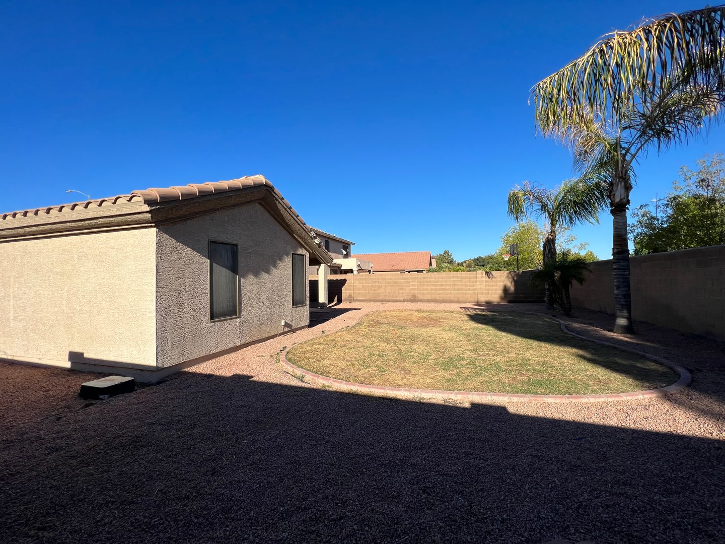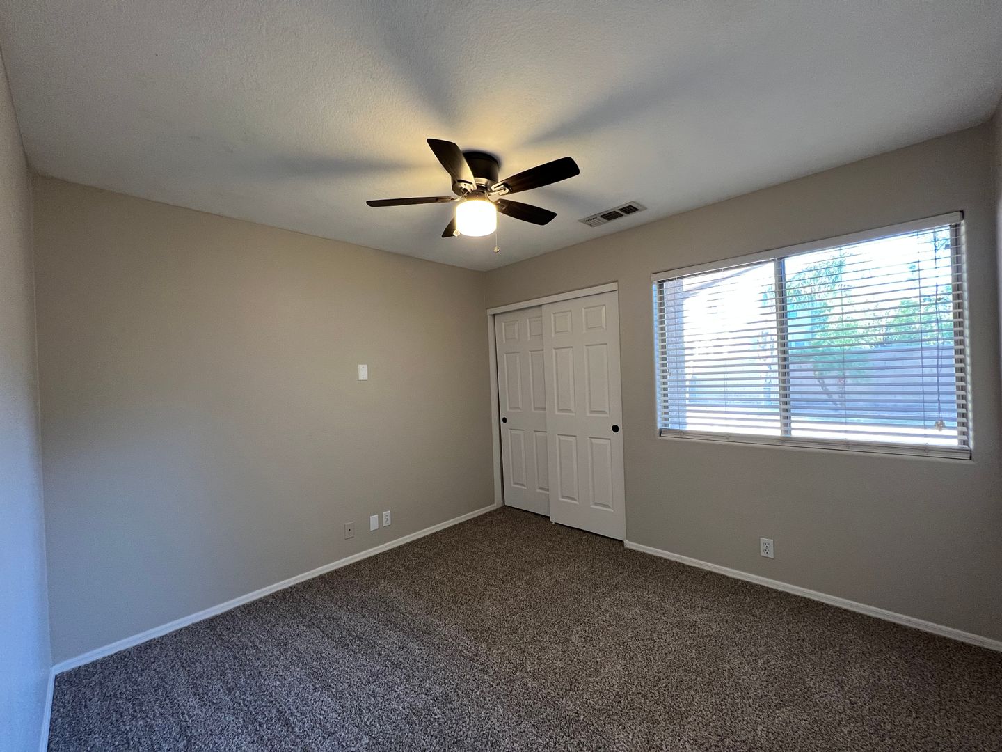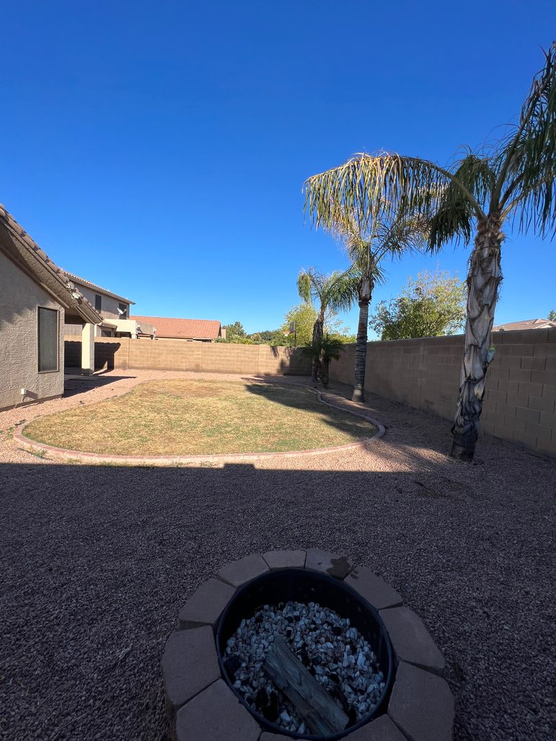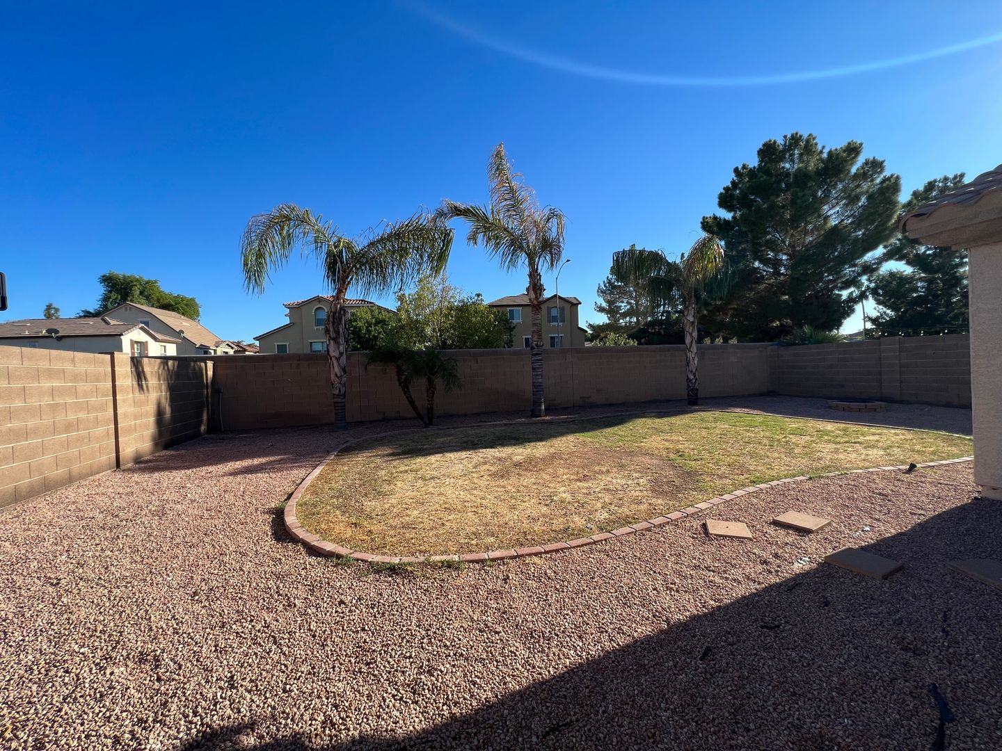 This adorable three bedroom split floor plan has neutral 20' tile, neutral paint and carpet, vaulted ceilings, natural stone accent wall in family room, open kitchen with center island, stainless appliances, plentiful cabinet and counter space plus a separate pantry closet. Primary bedroom has 2 closets and several windows allowing for lots of natural light and ensuite bathroom including a separate soaker tub and shower. Guest bedrooms are split from the main and flank the guest bathroom. The desert front yard is easy maintenance, backyard has a beautiful grassy area surrounded by gravel, palm trees and a fire pit. Across the street from the neighborhood park and volleyball court; Walking distance to Augusta Ranch Elementary School. **NOT LISTED ON FACEBOOK.