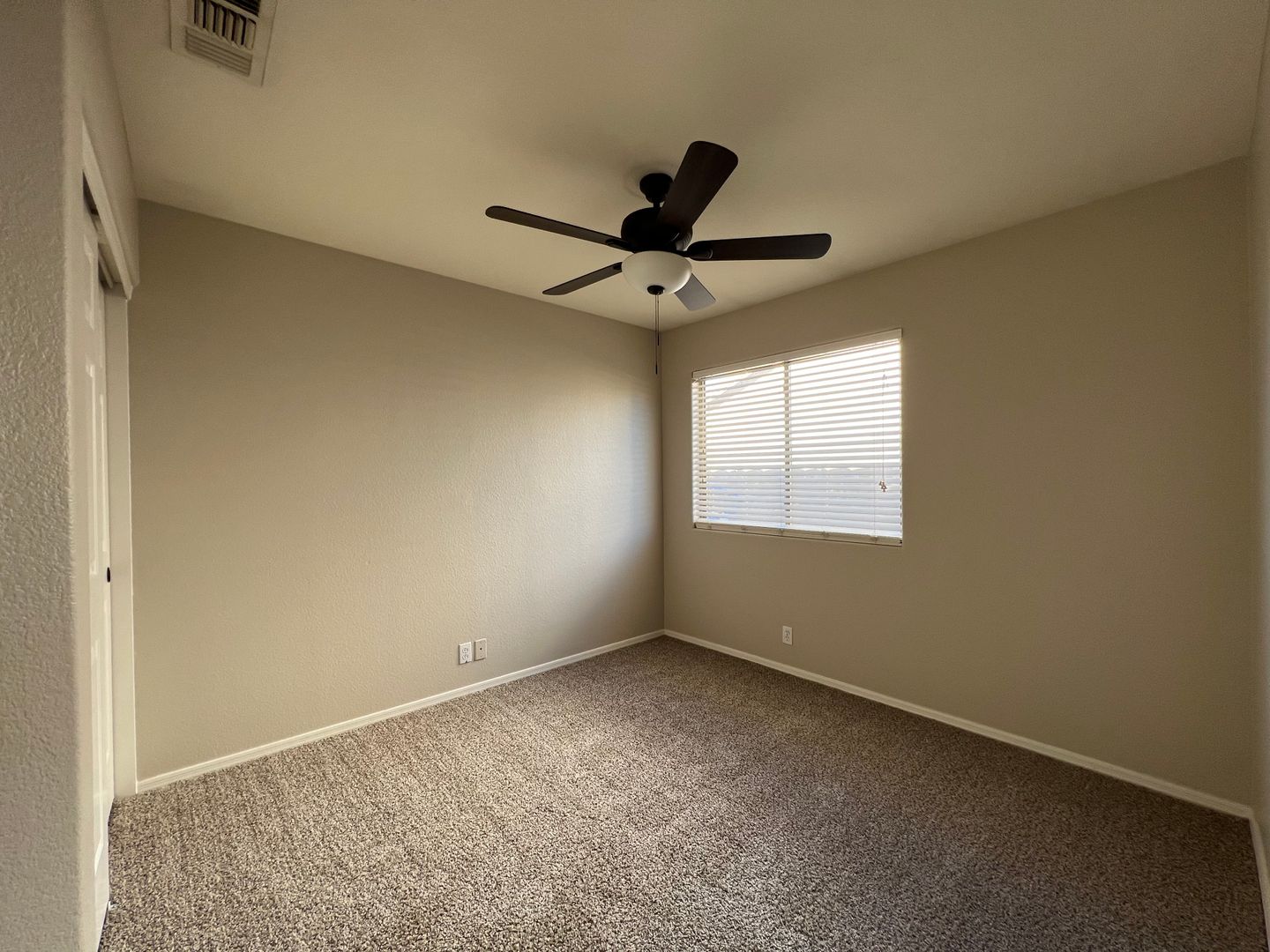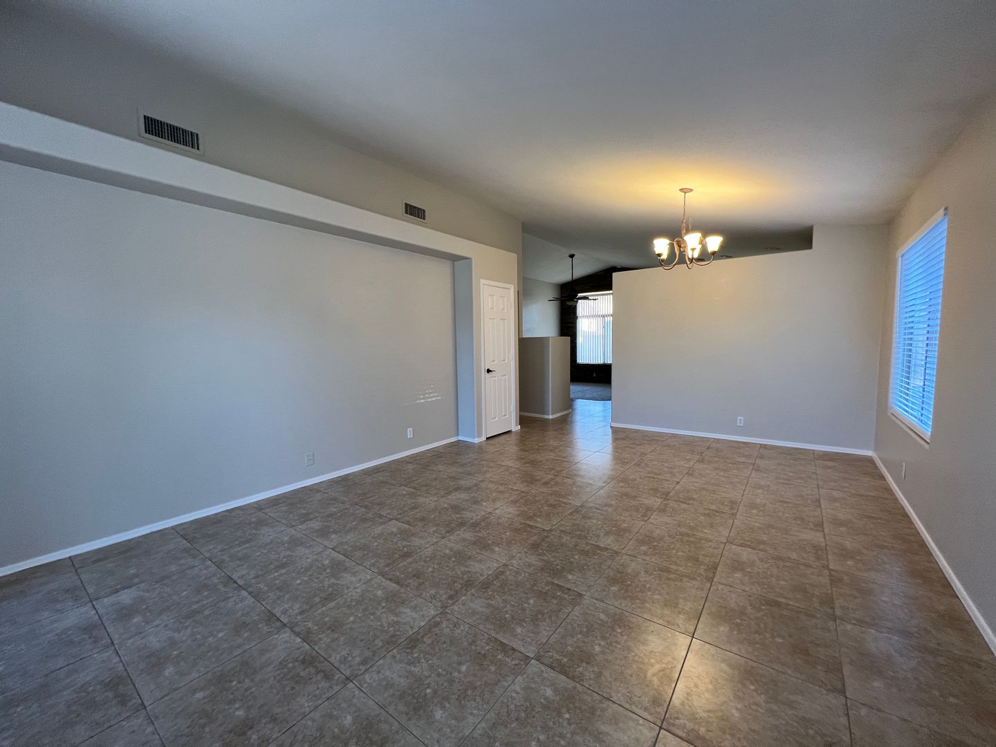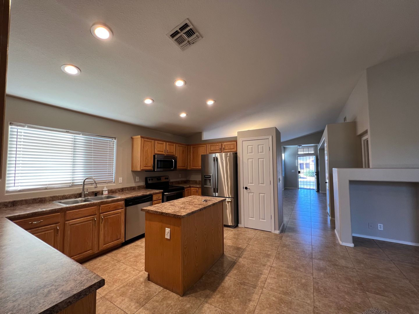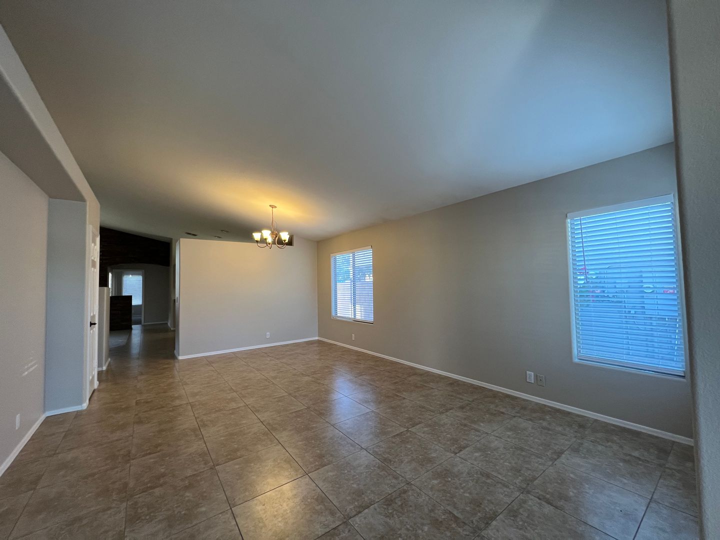 This adorable three bedroom split floor plan has neutral 20' tile, neutral paint and carpet, vaulted ceilings, natural stone accent wall in family room, open kitchen with center island, stainless appliances, plentiful cabinet and counter space plus a separate pantry closet. Primary bedroom has 2 closets and several windows allowing for lots of natural light and ensuite bathroom including a separate soaker tub and shower. Guest bedrooms are split from the main and flank the guest bathroom. The desert front yard is easy maintenance, backyard has a beautiful grassy area surrounded by gravel, palm trees and a fire pit. Across the street from the neighborhood park and volleyball court; Walking distance to Augusta Ranch Elementary School. **NOT LISTED ON FACEBOOK.