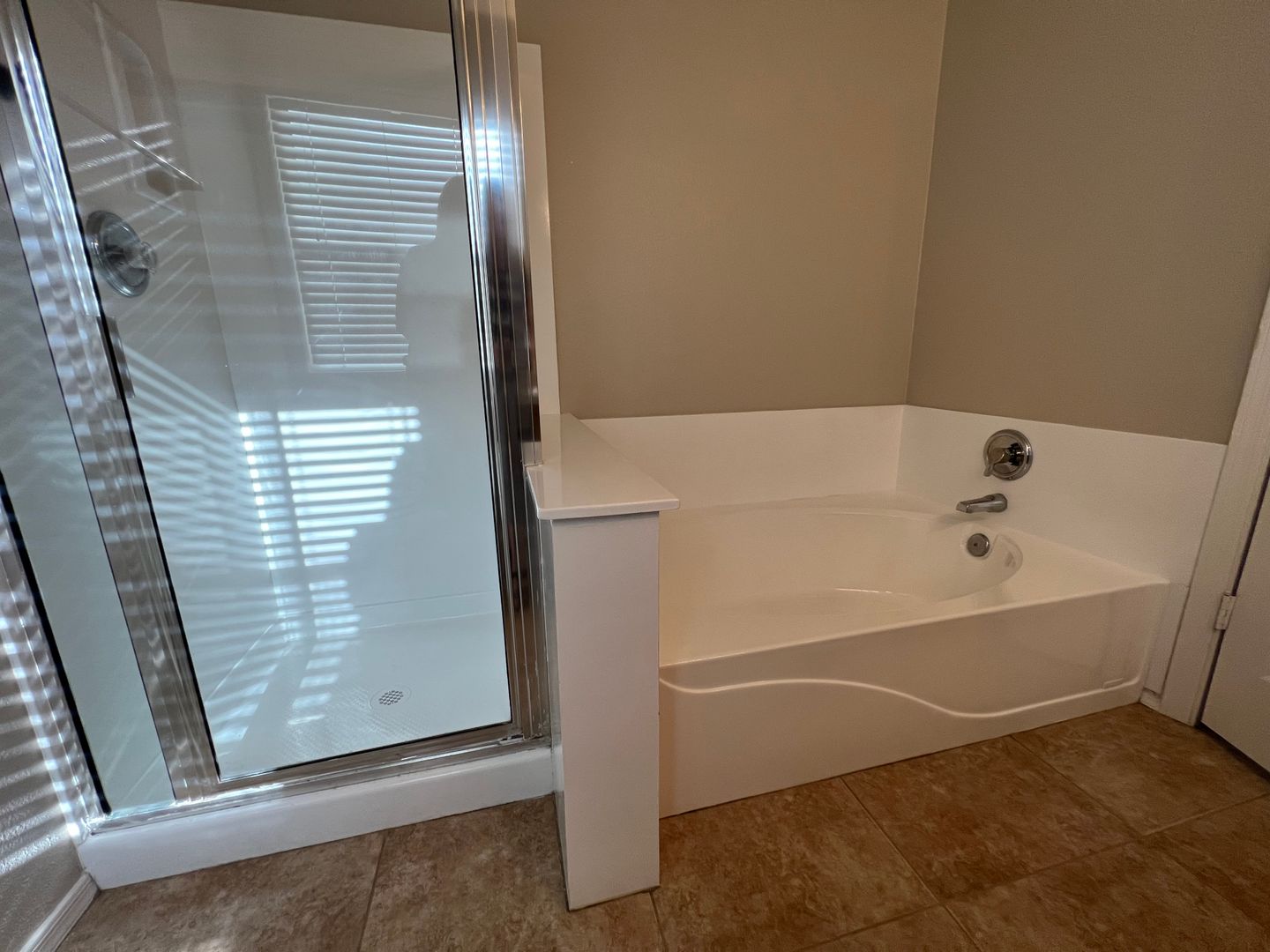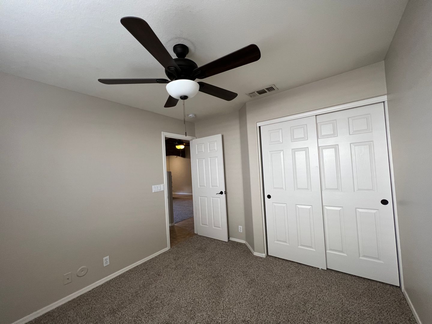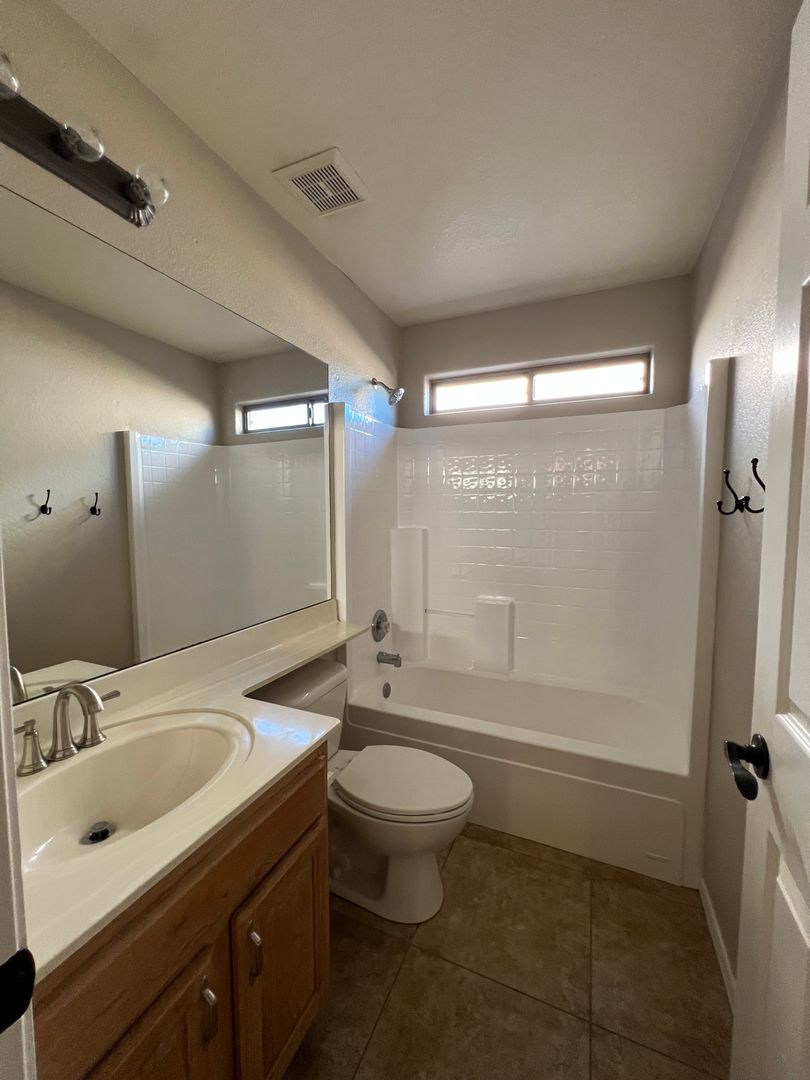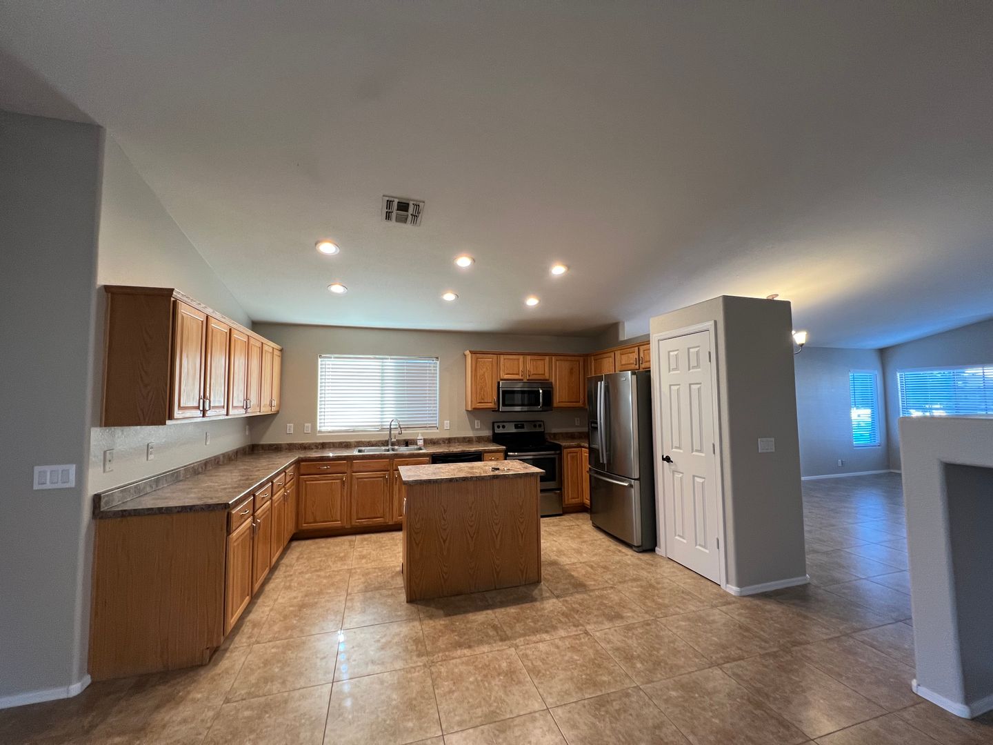 This adorable three bedroom split floor plan has neutral 20' tile, neutral paint and carpet, vaulted ceilings, natural stone accent wall in family room, open kitchen with center island, stainless appliances, plentiful cabinet and counter space plus a separate pantry closet. Primary bedroom has 2 closets and several windows allowing for lots of natural light and ensuite bathroom including a separate soaker tub and shower. Guest bedrooms are split from the main and flank the guest bathroom. The desert front yard is easy maintenance, backyard has a beautiful grassy area surrounded by gravel, palm trees and a fire pit. Across the street from the neighborhood park and volleyball court; Walking distance to Augusta Ranch Elementary School. **NOT LISTED ON FACEBOOK.
